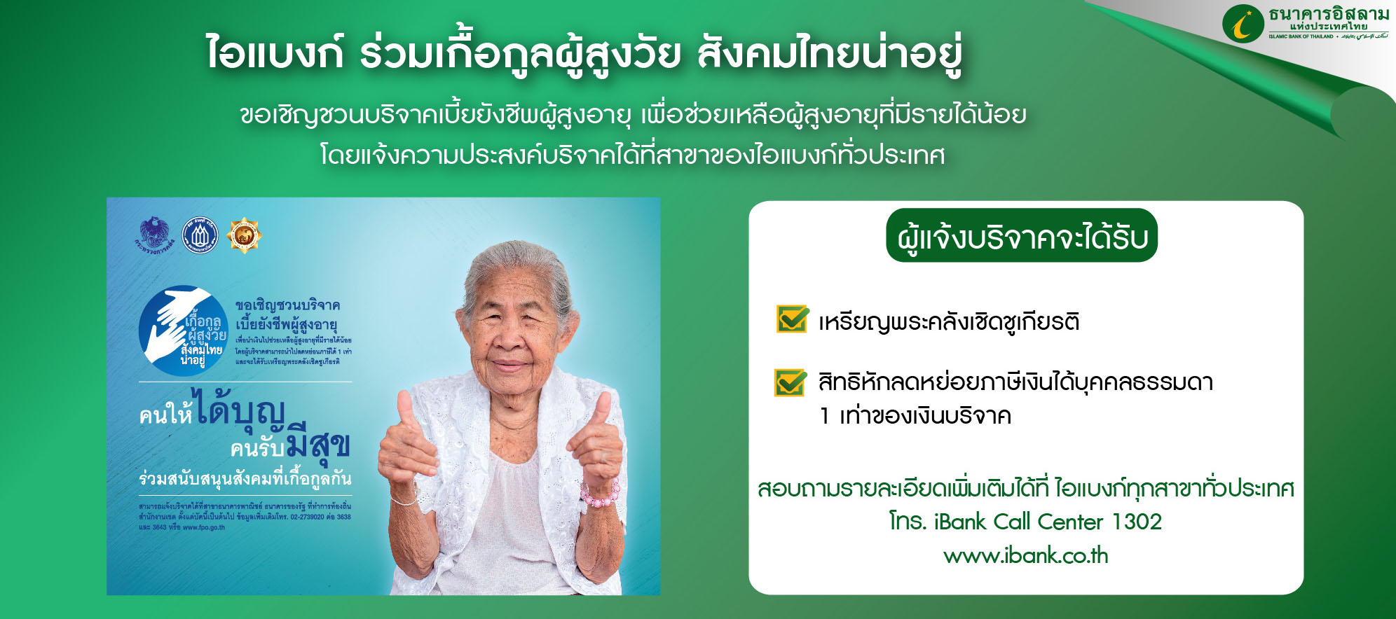 ผู้สูงอายุที่สนใจแจ้งบริจาค สามารถขอข้อมูลเพิ่มเติมได้ที่ไอแบงก์ ทุกสาขา โทร. 1302
