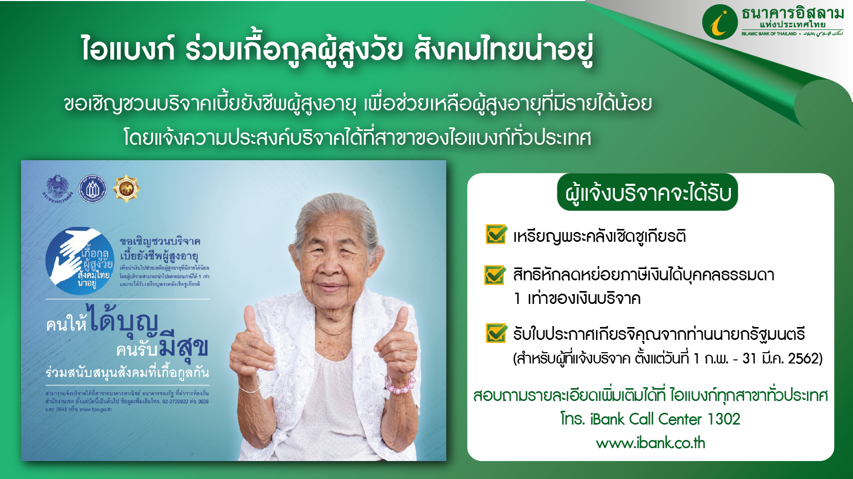 ไอแบงก์ ร่วมเกื้อกูลผู้สูงวัย สังคมไทยน่าอยู่ ขอเชิญชวนบริจาคเบื้ยยังชีพผู้สูงอายุ เพื่อช่วยเหลือผู้สูงอายุที่มีรายได้น้อย โดยแจ้งความประสงค์บริจาคได้