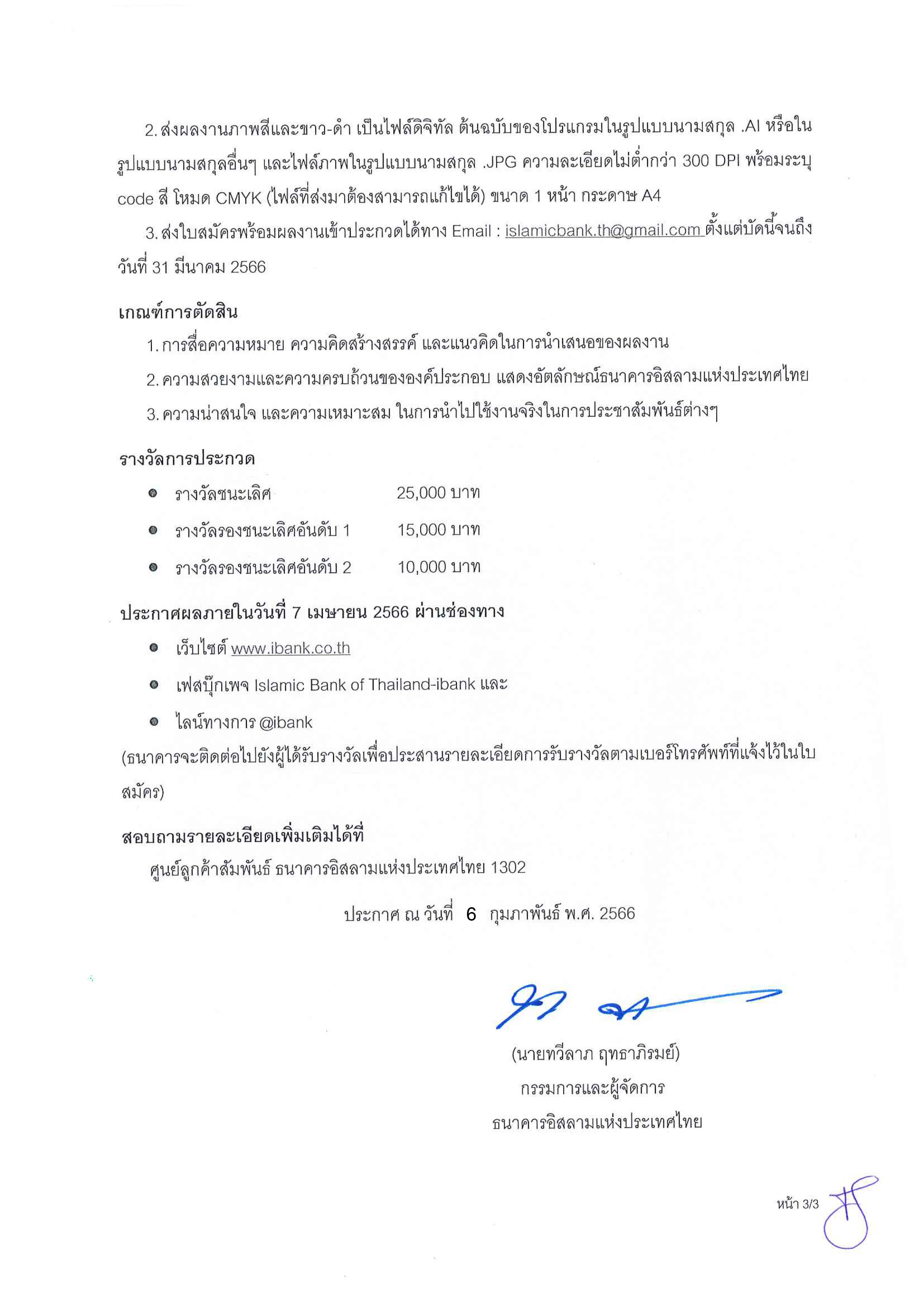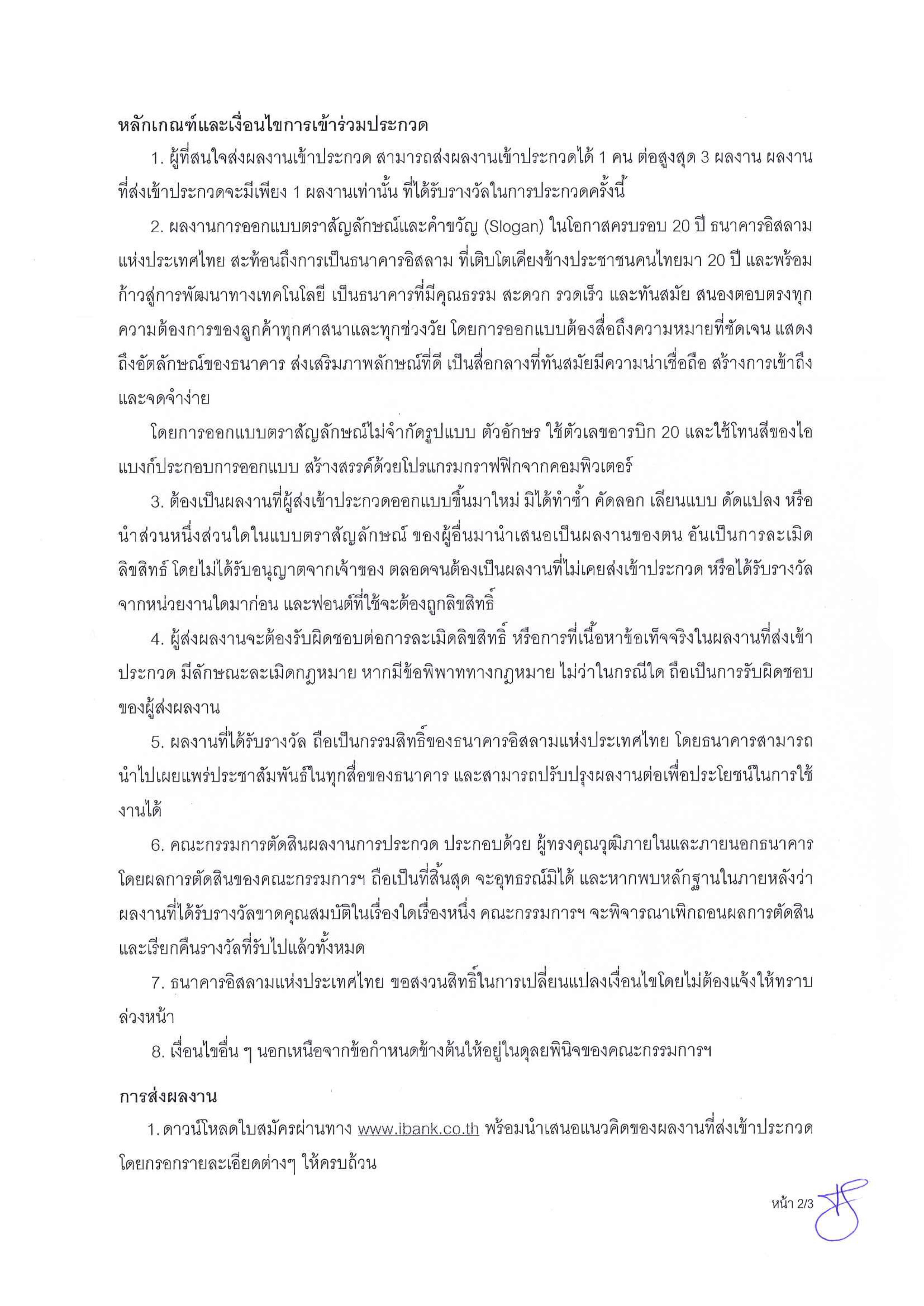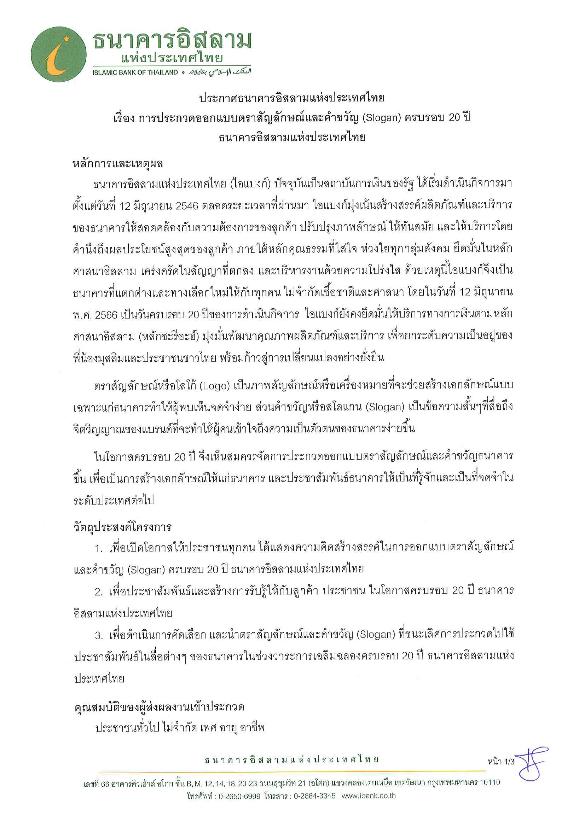 ธนาคารอิสลามแห่งประเทศไทย (ไอแบงก์) เชิญชวนนักออกแบบร่วมประกวดออกแบบตราสัญลักษณ์และคำขวัญ (Slogan) ในโอกาสครบรอบ 20 ปี ชิงเงินรางวัลรวม 50,000 บาท สามารถส่งผลงานเข้าประกวดได้ตั้งแต่วันนี้ จนถึงวันที่ 31 มีนาคม 2566