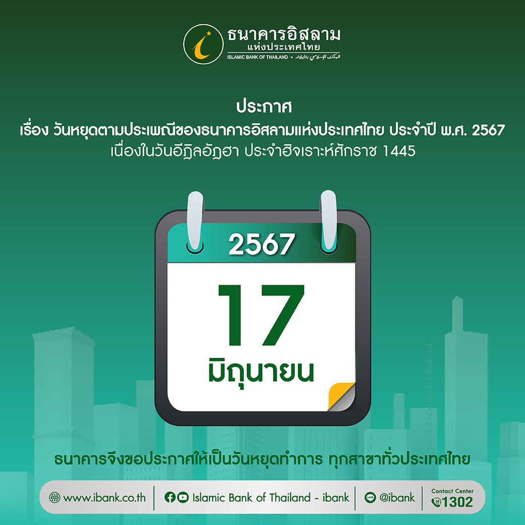 Home About us Announcements Others ประกาศวันหยุดตามประเพณีของธนาคารอิสลามแห่งประเทศไทย ประจำปี พ.ศ. 2567 ประกาศวันหยุดตามประเพณีของธนาคารอิสลามแห่งประเทศไทย ประจำปี พ.ศ. 2567 Announcements Procuments Others Career 12 June 2024 share Like 0 Tags