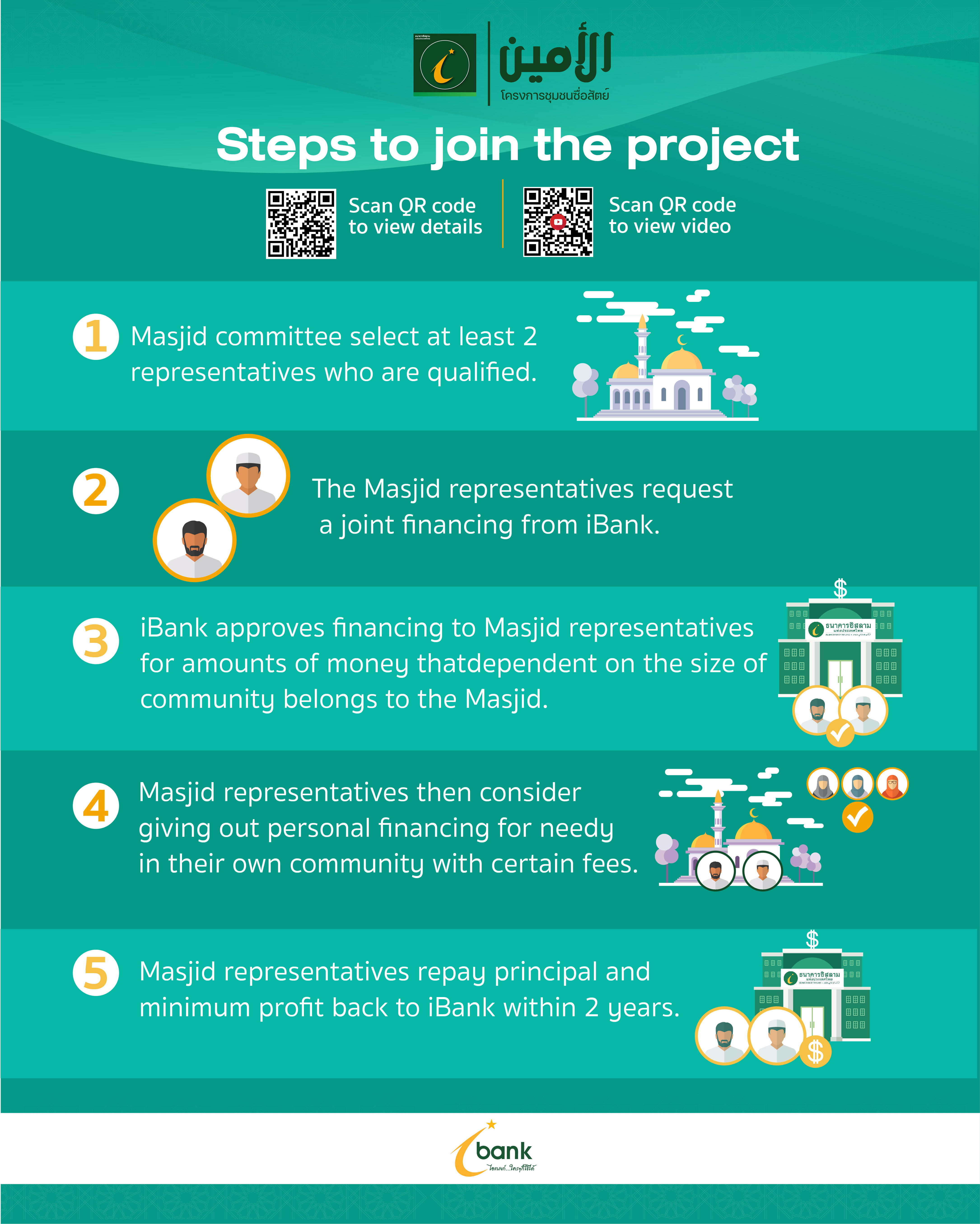 โดยธนาคารจะให้สินเชื่อวงเงินเบิกถอนเงินสด (B-Cash line) ตามหลักบัยอ์ อัลอีนะฮ์ แก่บุคคลผู้ดูแลโครงการ และผู้ดูแลโครงการจะพิจารณาให้สินเชื่อแก่สัปปุรุษต่อรายละไม่เกิน 10,000 บาท