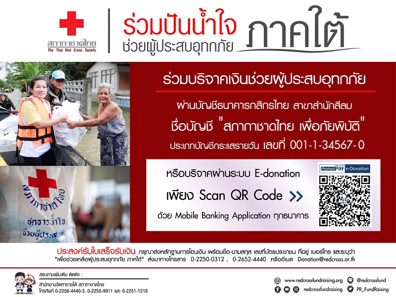 - สภากาชาดไทย เชิญชวนผู้มีจิตศรัทธาร่วมปันน้ำใจบริจาคเงิน เพื่อช่วยเหลือผู้ประสบอุทกภัยภาคใต้