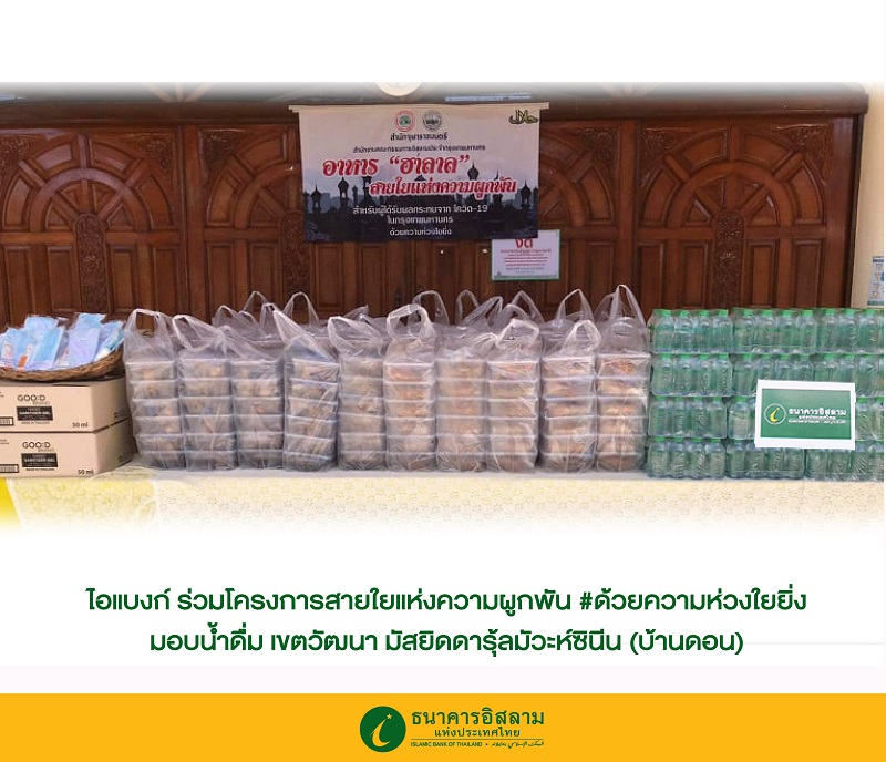 ธนาคารอิสลามแห่งประเทศไทย (ไอแบงก์) ร่วมกับ สำนักจุฬาราชมนตรี และคณะกรรมการอิสลามประจำกรุงเทพมหานคร (กอ.กทม.) ภายใต้โครงการสายใยแห่งความผูกพัน #ด้วยความห่วงใยยิ่ง เพื่อช่วยเหลือพี่น้องประชาชนในชุมชนต่างๆในกทม. ที่ประสบปัญหาการแพร่ระบาดของโควิด-19 โดยเมื่อวานนี้ (20 มิถุนายน 2564) ไอแบงก์ได้ร่วมมอบน้ำดื่มธนาคาร จำนวน 1,200 ขวด แก่เขตวัฒนา เพื่อนำไปมอบให้กับพี่น้องมุสลิม และประชาชนทั่วไปที่ได้รับผลกระทบโควิด-19 ในบริเวณพื้นที่ชุมชนต่างๆในเขตวัฒนา ได้แก่ ชุมชนสุเหร่าบ้านดอน ชุมชนนวลน้อย ชุมชนนวลจันทร์ และชุมชนแจ่มจันทร์ ณ มัสยิดดารุ้ลมัวะห์ซีนีน (บ้านดอน)