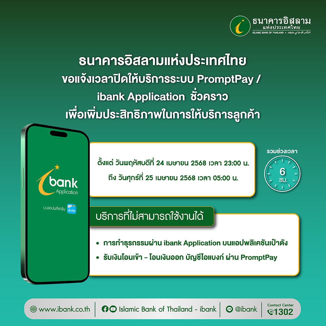- ไอแบงก์ ขอแจ้งเวลาปิดบริการระบบ PromptPay / ibank Application ชั่วคราว เพื่อเพิ่มประสิทธิภาพในการให้บริการลูกค้า