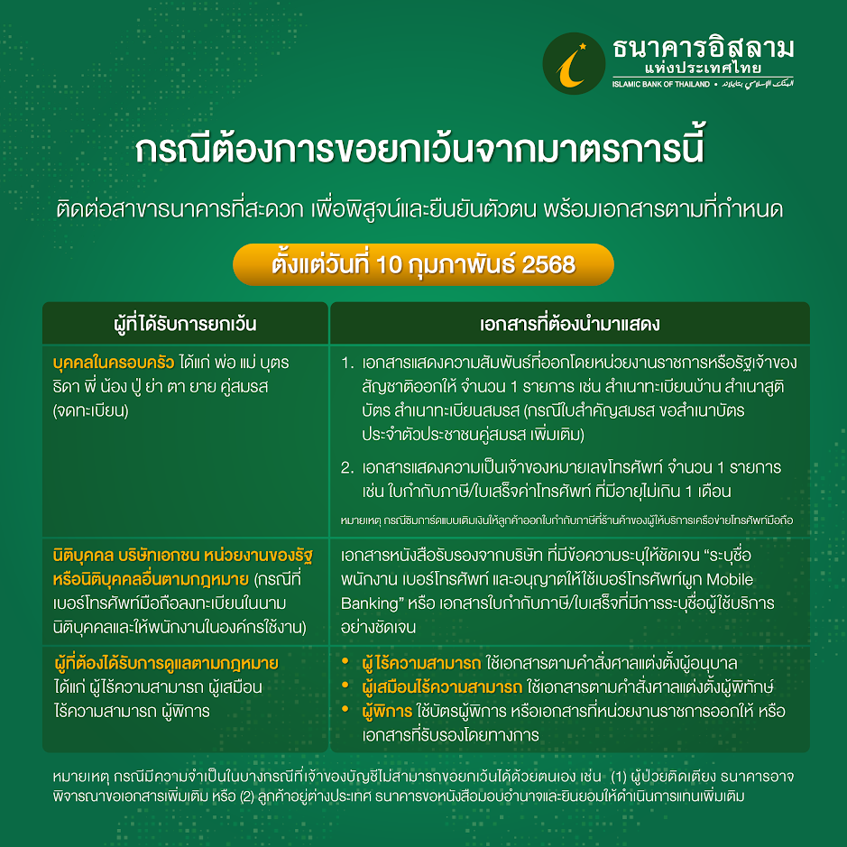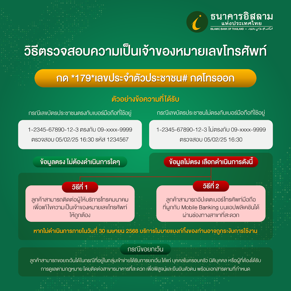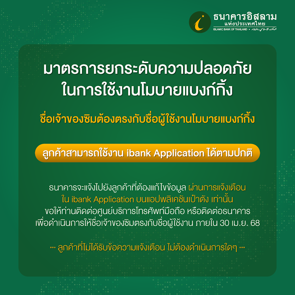 หากลูกค้ามีข้อมูลไม่ตรง ธนาคารจะแจ้งผ่านการแจ้งเตือนใน ibank Application บนแอปพลิเคชันเป๋าตัง เท่านั้น ขอให้ท่านติดต่อศูนย์บริการโทรศัพท์มือถือ หรือติดต่อธนาคาร เพื่อดำเนินการให้ชื่อเจ้าของซิมตรงกับชื่อผู้ใช้งาน ภายใน 30 เม.ย. 68 หากไม่ดำเนินการภายในกำหนด บริการโมบายแบงก์กิ้งของท่านอาจถูกระงับการใช้งาน