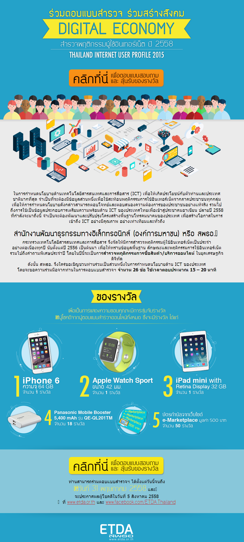 ไอแบงก์ขอเชิญชวนทุกท่านในการตอบแบบสำรวจพฤติกรรมผู้ใช้อินเตอร์เน็ตปี 2558 เพื่อสร้างโอกาสในการเข้าถึง ICT อย่างมีคุณภาพ เท่าเทียมและทั่วถึง