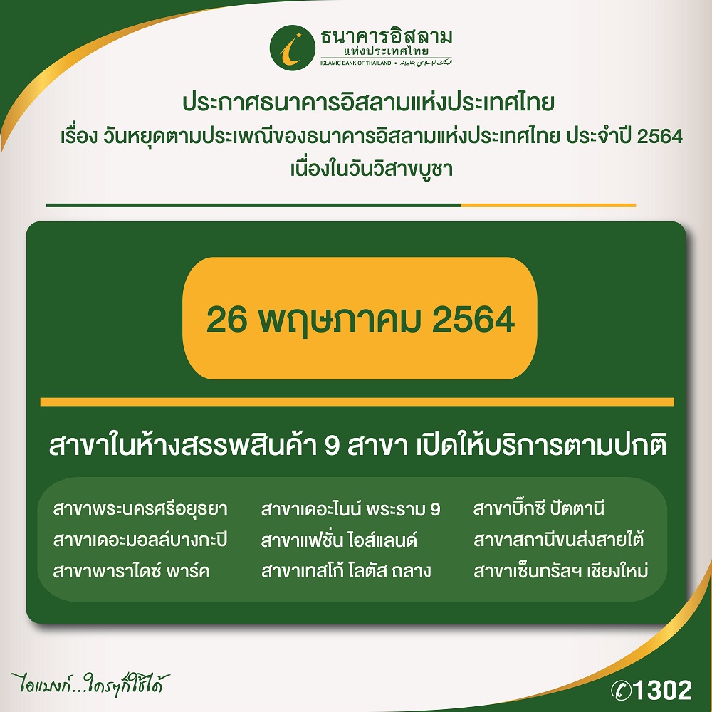 ประกาศธนาคารอิสลามแห่งประเทศไทย เรื่องวันหยุดตามประเพณีของธนาคารอิสลามแห่งประเทศไทย ประจำปี 2564 เนื่องในวันวิสาขบูชา