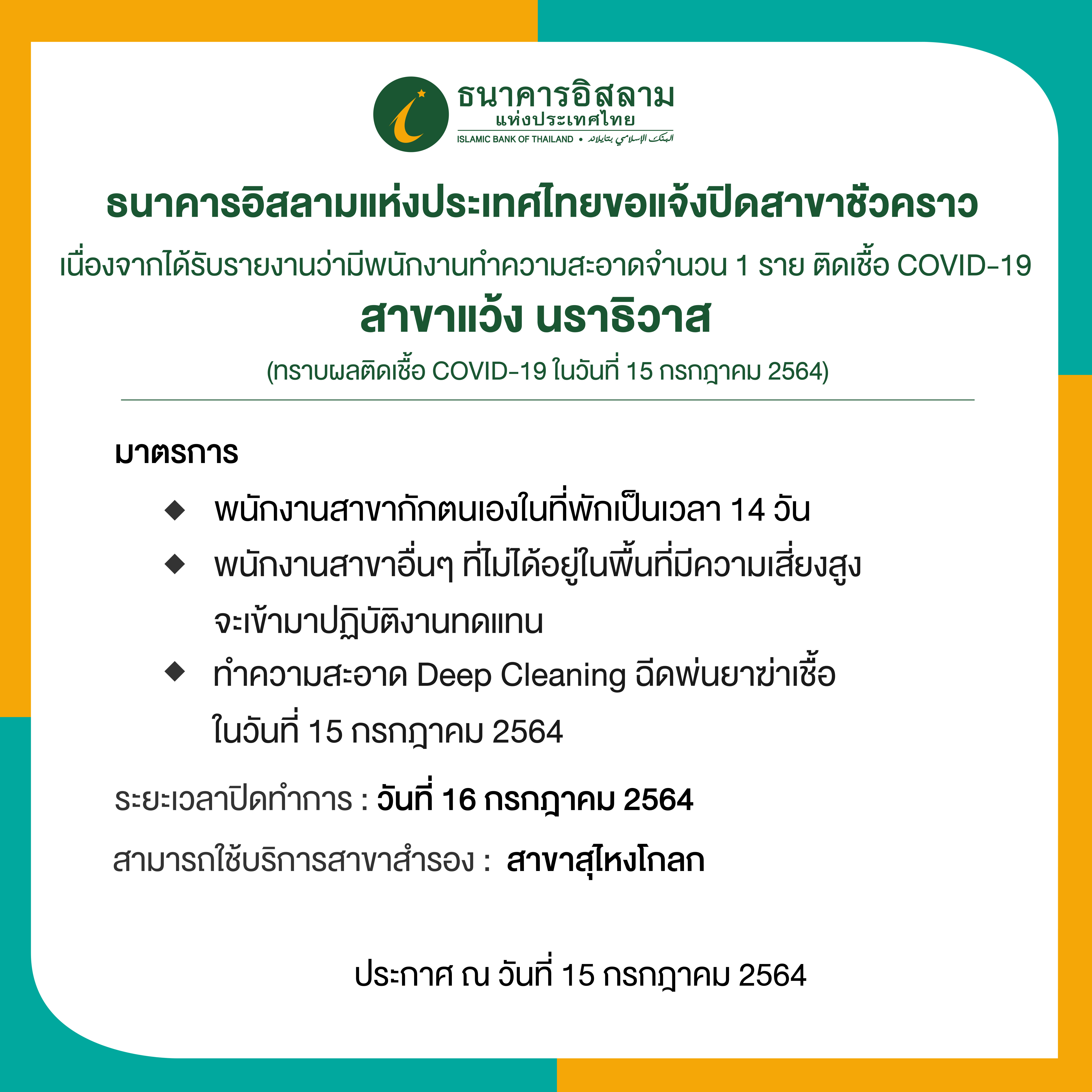 หน้าหลัก เกี่ยวกับ ibank ประกาศธนาคาร ประกาศอื่น ประกาศธนาคารอิสลามแห่งประเทศไทย กรณีพนักงานทำความสะอาด จำนวน 1 ราย ติดเชื้อโควิด-19 ประกาศธนาคารอิสลามแห่งประเทศไทย กรณีพนักงานทำความสะอาด จำนวน 1 ราย ติดเชื้อโควิด-19 ประกาศธนาคาร ประกาศจัดซื้อจัดจ้าง ประกาศอื่น ร่วมงานกับ ibank 15 กรกฎาคม 2564 share Like 0 Tags
