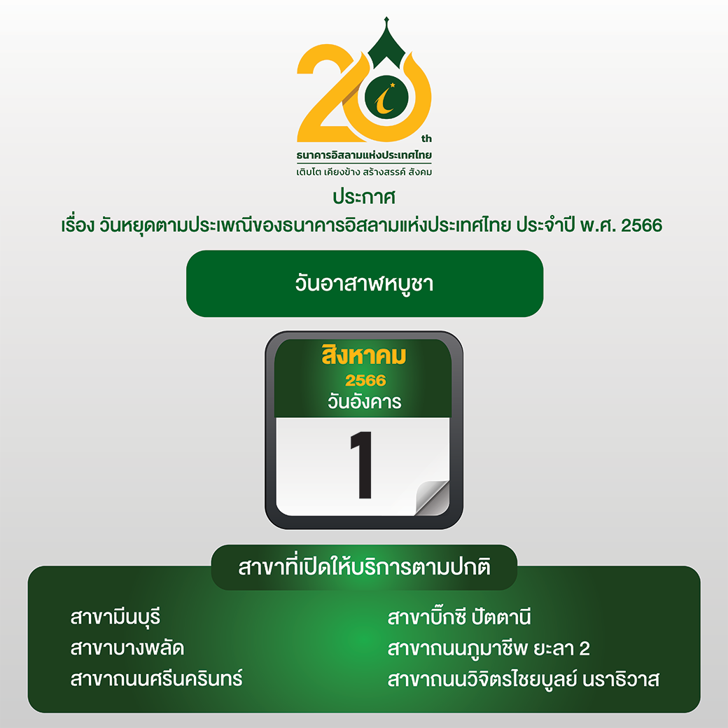 หน้าหลัก เกี่ยวกับ ibank ประกาศธนาคาร ประกาศอื่น ประกาศเรื่องวันหยุดตามประเพณีของธนาคารอิสลามฯ ประกาศเรื่องวันหยุดตามประเพณีของธนาคารอิสลามฯ ประกาศธนาคาร ประกาศจัดซื้อจัดจ้าง ประกาศอื่น ร่วมงานกับ ibank 31 กรกฎาคม 2566 share Like 0 Tags