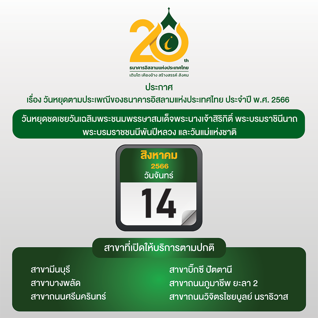หน้าหลัก เกี่ยวกับ ibank ประกาศธนาคาร ประกาศอื่น ประกาศ เรื่องวันหยุดตามประเพณีของธนาคารอิสลามแห่งประเทศไทย ประกาศ เรื่องวันหยุดตามประเพณีของธนาคารอิสลามแห่งประเทศไทย ประกาศธนาคาร ประกาศจัดซื้อจัดจ้าง ประกาศอื่น ร่วมงานกับ ibank 10 สิงหาคม 2566 share Like 0 Tags