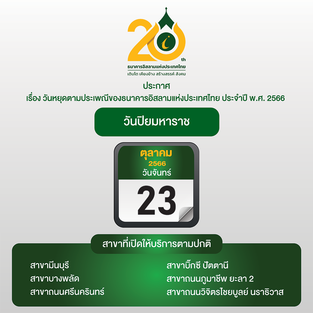 หน้าหลัก เกี่ยวกับ ibank ประกาศธนาคาร ประกาศอื่น ประกาศ เรื่องวันหยุดตามประเพณีของธนาคารอิสลามแห่งประเทศไทย ประกาศ เรื่องวันหยุดตามประเพณีของธนาคารอิสลามแห่งประเทศไทย ประกาศธนาคาร ประกาศจัดซื้อจัดจ้าง ประกาศอื่น ร่วมงานกับ ibank 20 ตุลาคม 2566 share Like 0 Tags