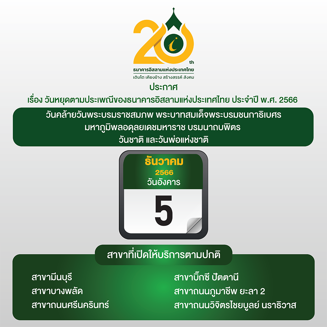 หน้าหลัก เกี่ยวกับ ibank ประกาศธนาคาร ประกาศอื่น ประกาศ เรื่องวันหยุดตามประเพณีของธนาคารอิสลามแห่งประเทศไทย ประกาศ เรื่องวันหยุดตามประเพณีของธนาคารอิสลามแห่งประเทศไทย ประกาศธนาคาร ประกาศจัดซื้อจัดจ้าง ประกาศอื่น ร่วมงานกับ ibank 4 ธันวาคม 2566 share Like 0 Tags