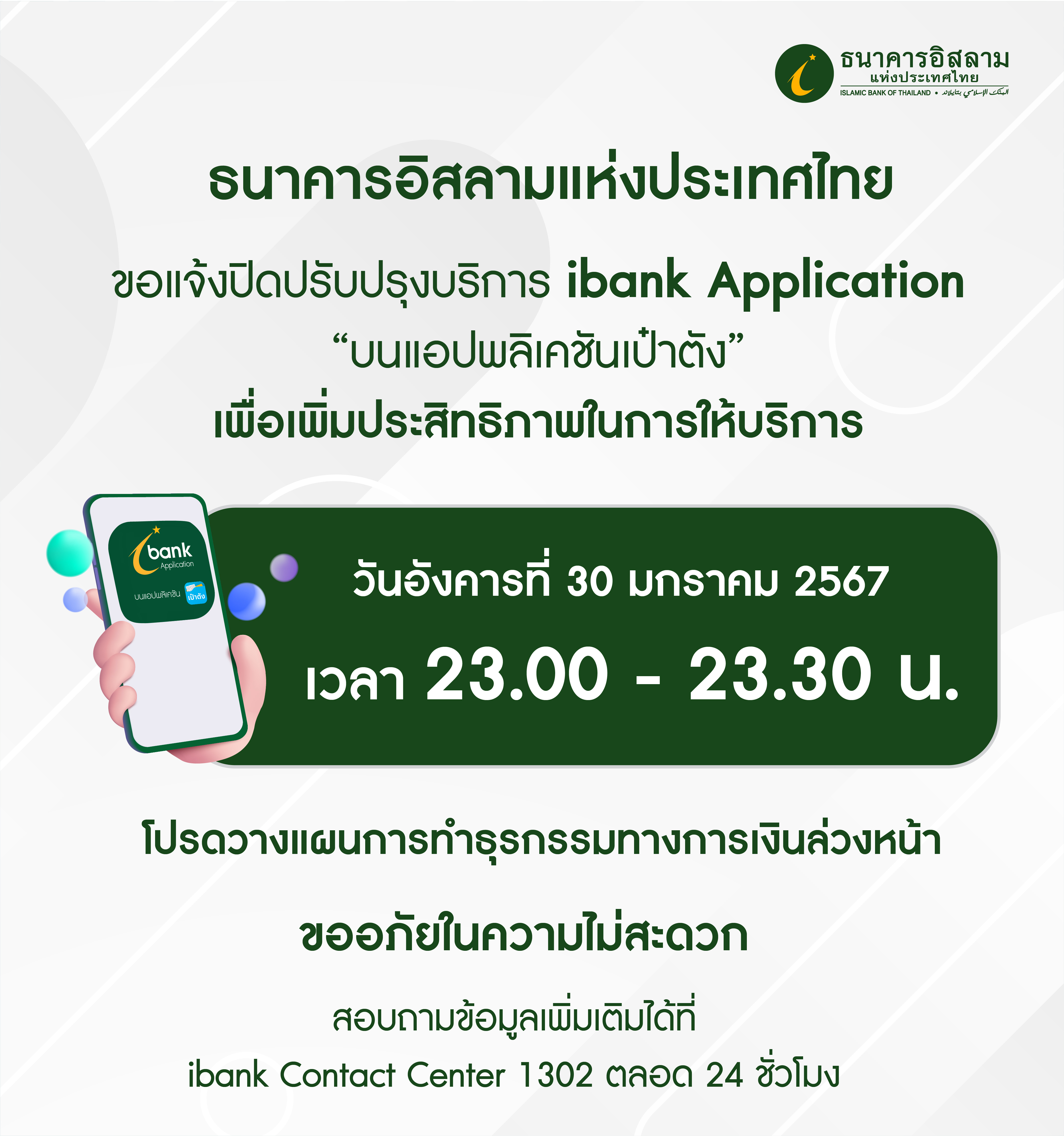 - ไอแบงก์ แจ้งปิดปรับปรุงบริการ ibank Application “บนแอปพลิเคชันเป๋าตัง” เพื่อเพิ่มประสิทธิภาพในการให้บริการ