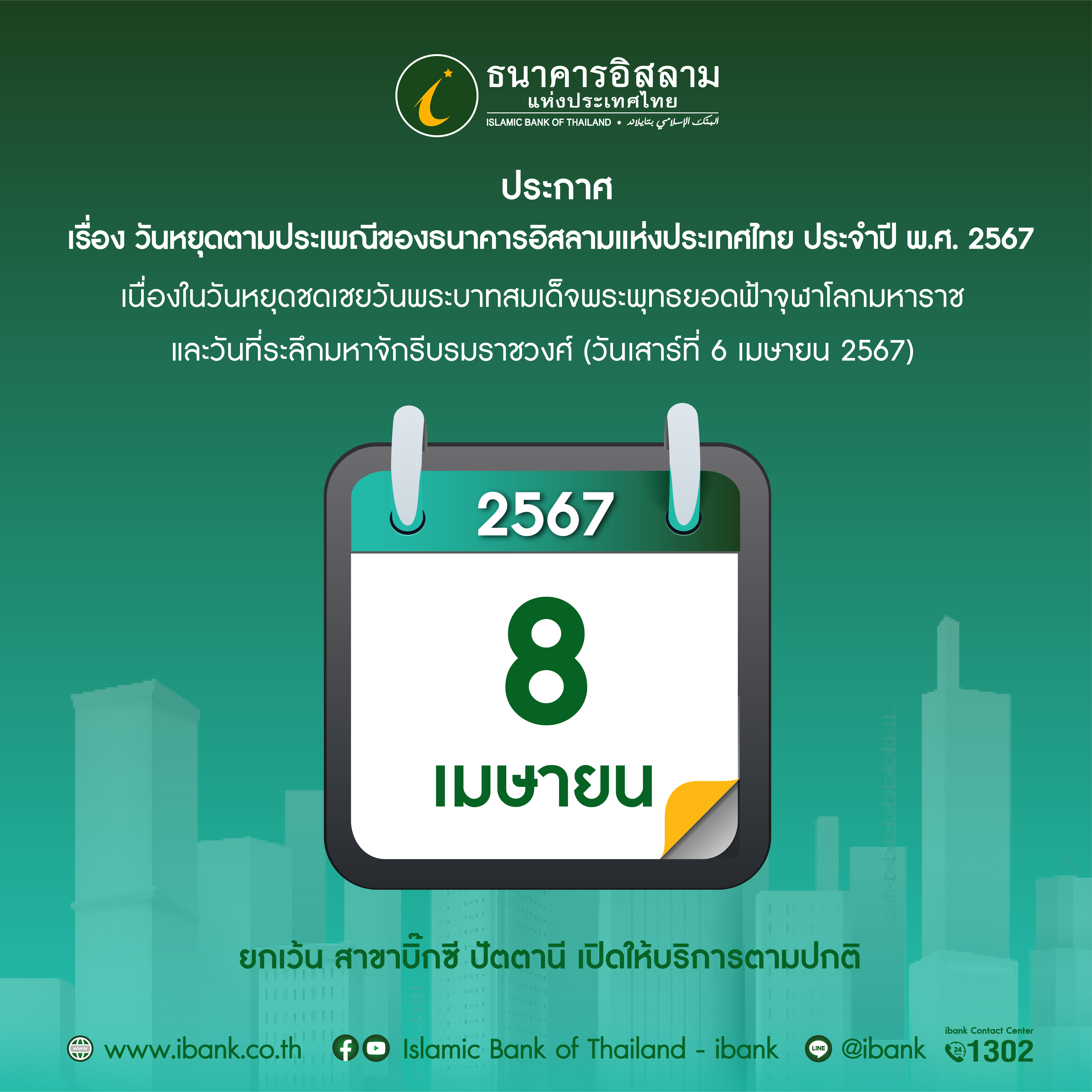 หน้าหลัก เกี่ยวกับ ibank ประกาศธนาคาร ประกาศอื่น ประกาศ เรื่องวันหยุดตามประเพณีของธนาคารอิสลามแห่งประเทศไทย ประกาศ เรื่องวันหยุดตามประเพณีของธนาคารอิสลามแห่งประเทศไทย ประกาศธนาคาร ประกาศจัดซื้อจัดจ้าง ประกาศอื่น ร่วมงานกับ ibank 5 เมษายน 2567 share Like 0 Tags