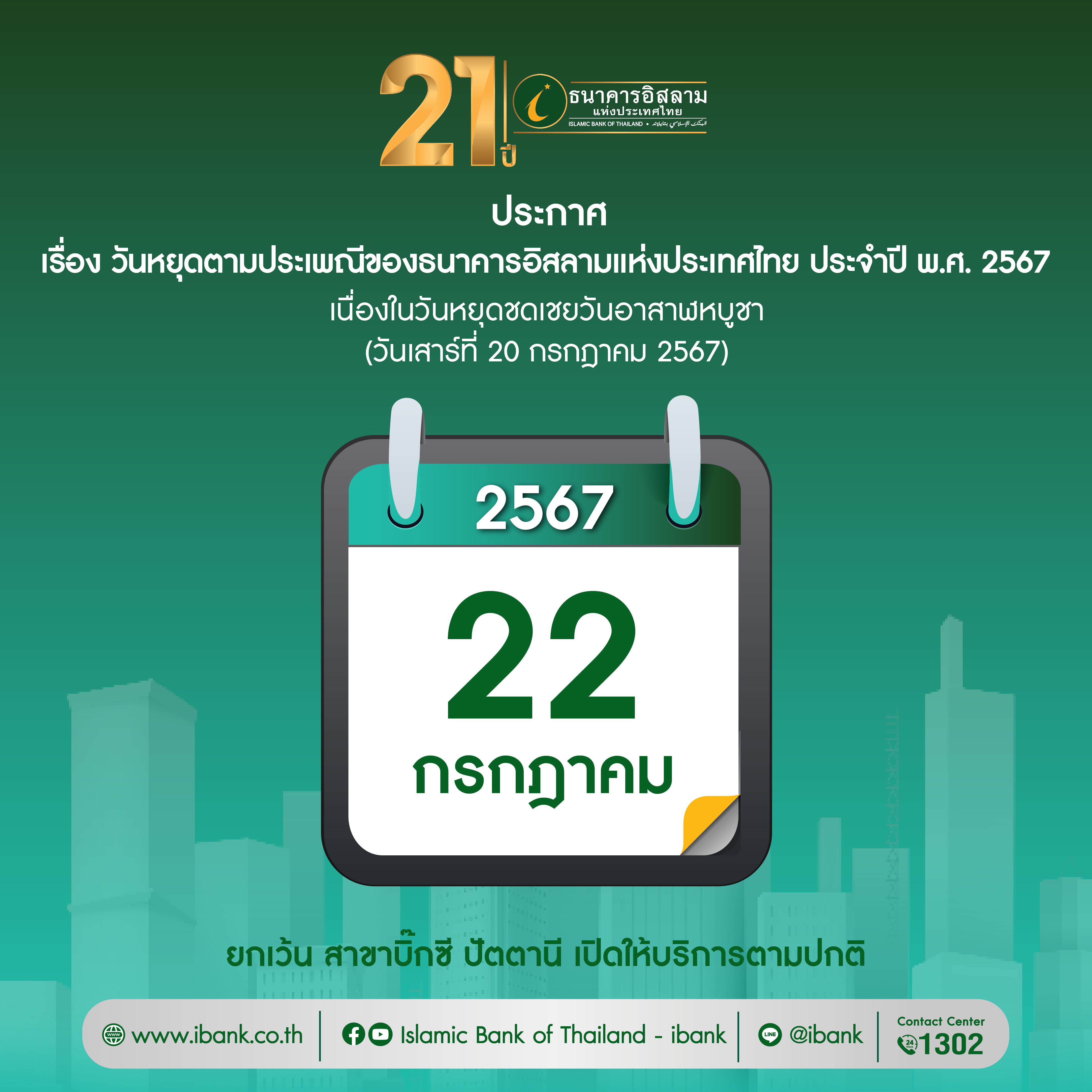 หน้าหลัก เกี่ยวกับ ibank ประกาศธนาคาร ประกาศอื่น ประกาศวันหยุดตามประเพณีของธนาคารอิสลามแห่งประเทศไทย ประจำปี พ.ศ. 2567 ประกาศวันหยุดตามประเพณีของธนาคารอิสลามแห่งประเทศไทย ประจำปี พ.ศ. 2567 ประกาศธนาคาร ประกาศจัดซื้อจัดจ้าง ประกาศอื่น ร่วมงานกับ ibank 19 กรกฎาคม 2567 share Like 0 Tags