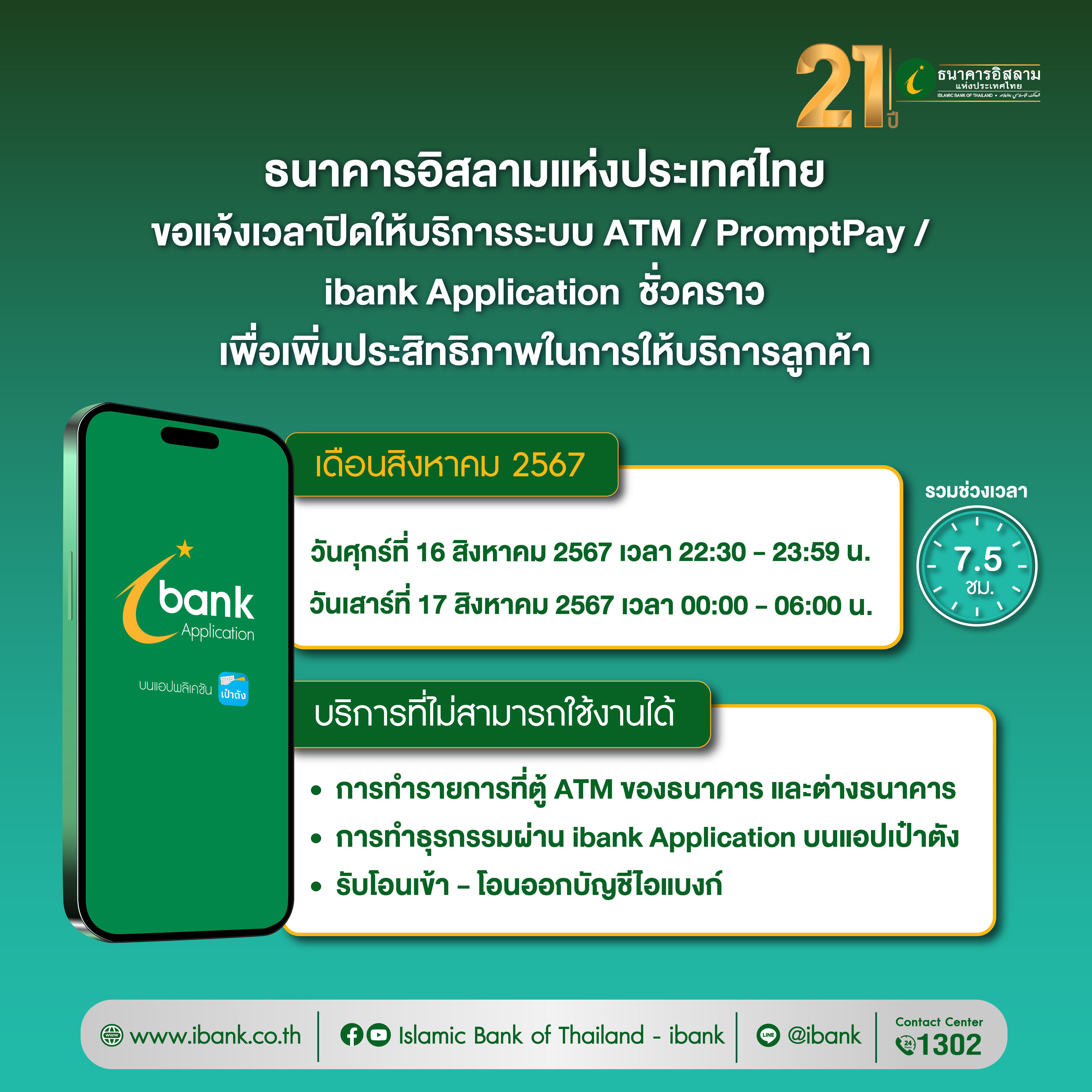 - ไอแบงก์ ขอแจ้งเวลาปิดบริการระบบ ATM / PromptPay / ibank Application เพื่อเพิ่มประสิทธิภาพในการให้บริการ