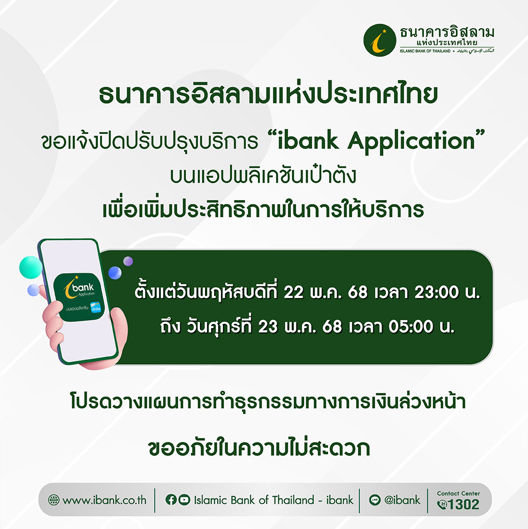 - ไอแบงก์ แจ้งปิดปรับปรุงบริการ "ibank Application" บนแอปพลิเคชันเป๋าตัง เพื่อเพิ่มประสิทธิภาพในการให้บริการ