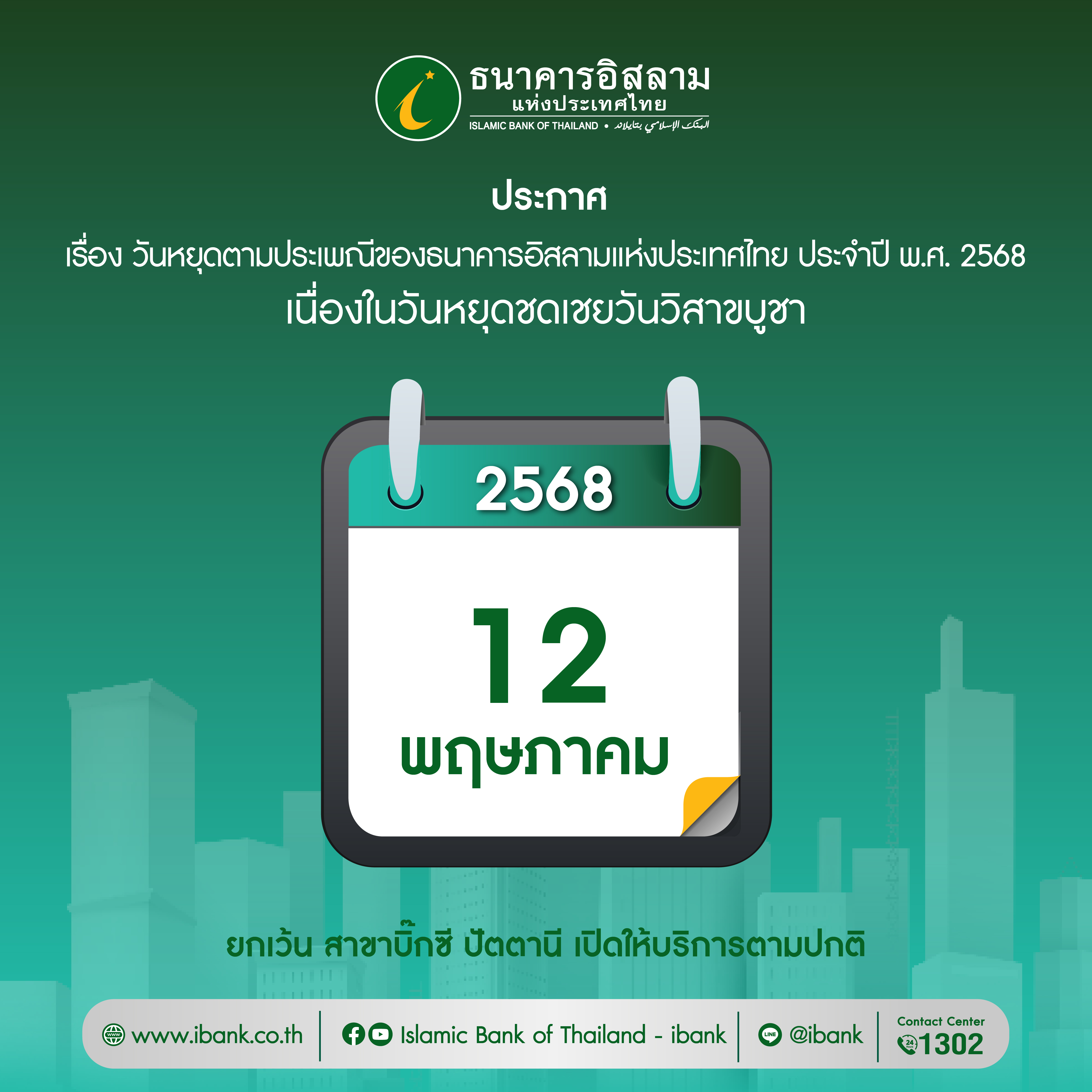หน้าหลัก เกี่ยวกับ ibank ประกาศธนาคาร ประกาศอื่น ประกาศวันหยุดตามประเพณีของธนาคารอิสลามแห่งประเทศไทย ประจำปี พ.ศ. 2568 ประกาศวันหยุดตามประเพณีของธนาคารอิสลามแห่งประเทศไทย ประจำปี พ.ศ. 2568 ประกาศธนาคาร ประกาศจัดซื้อจัดจ้าง ประกาศอื่น ร่วมงานกับ ibank 9 พฤษภาคม 2568 share Like 0 Tags