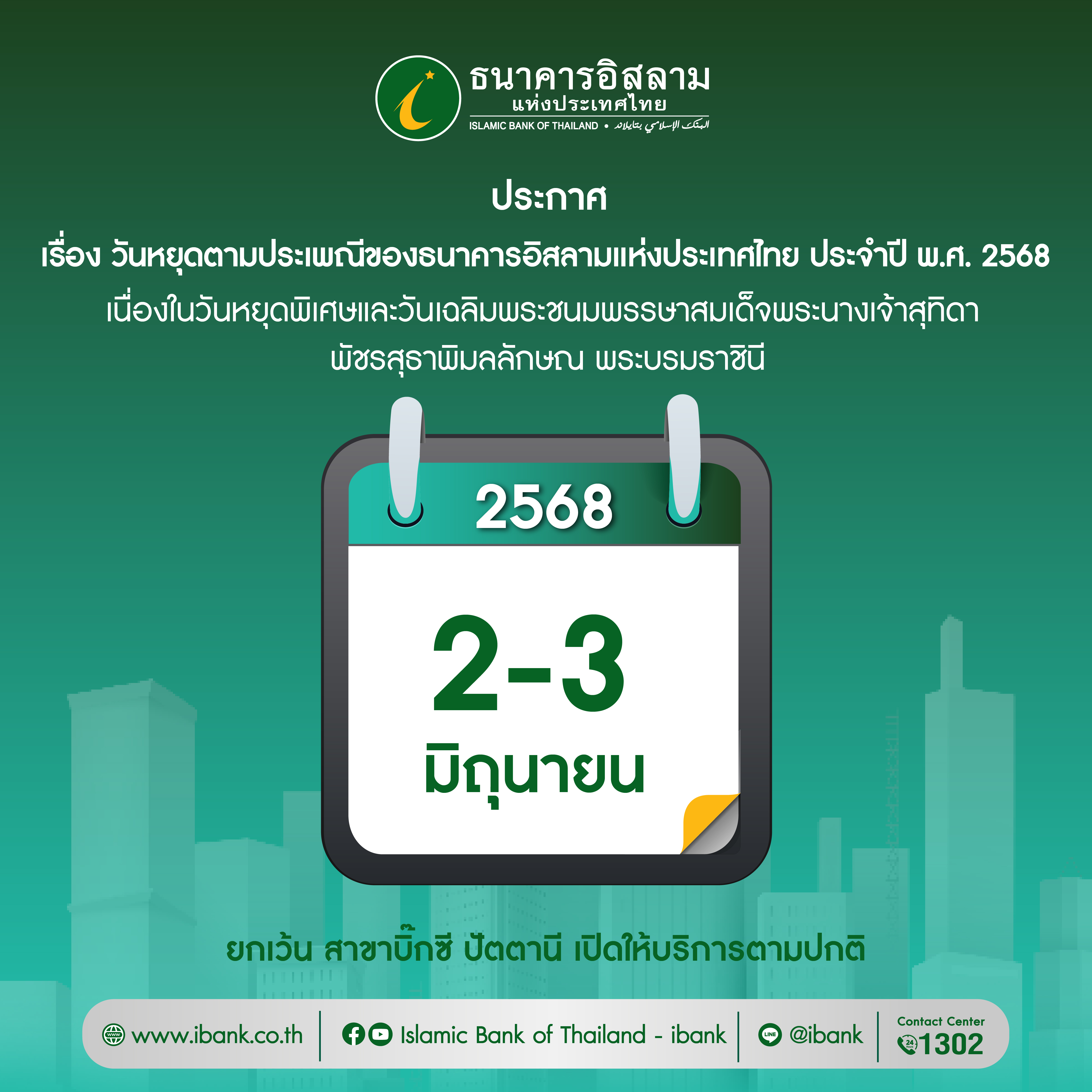 - ประกาศวันหยุดตามประเพณีของธนาคารอิสลามแห่งประเทศไทย ประจำปี พ.ศ. 2568 เนื่องในวันหยุดพิเศษและวันเฉลิมพระชนมพรรษาสมเด็จพระนางเจ้าสุทิดา พัชรสุธาพิมลลักษณ พระบรมราชินี