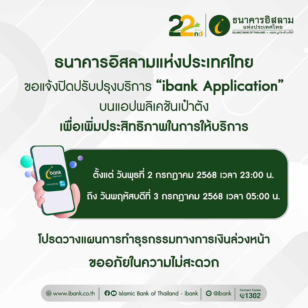 - ไอแบงก์ แจ้งปิดปรับปรุงบริการ "ibank Application" บนแอปพลิเคชันเป๋าตัง เพื่อเพิ่มประสิทธิภาพในการให้บริการ