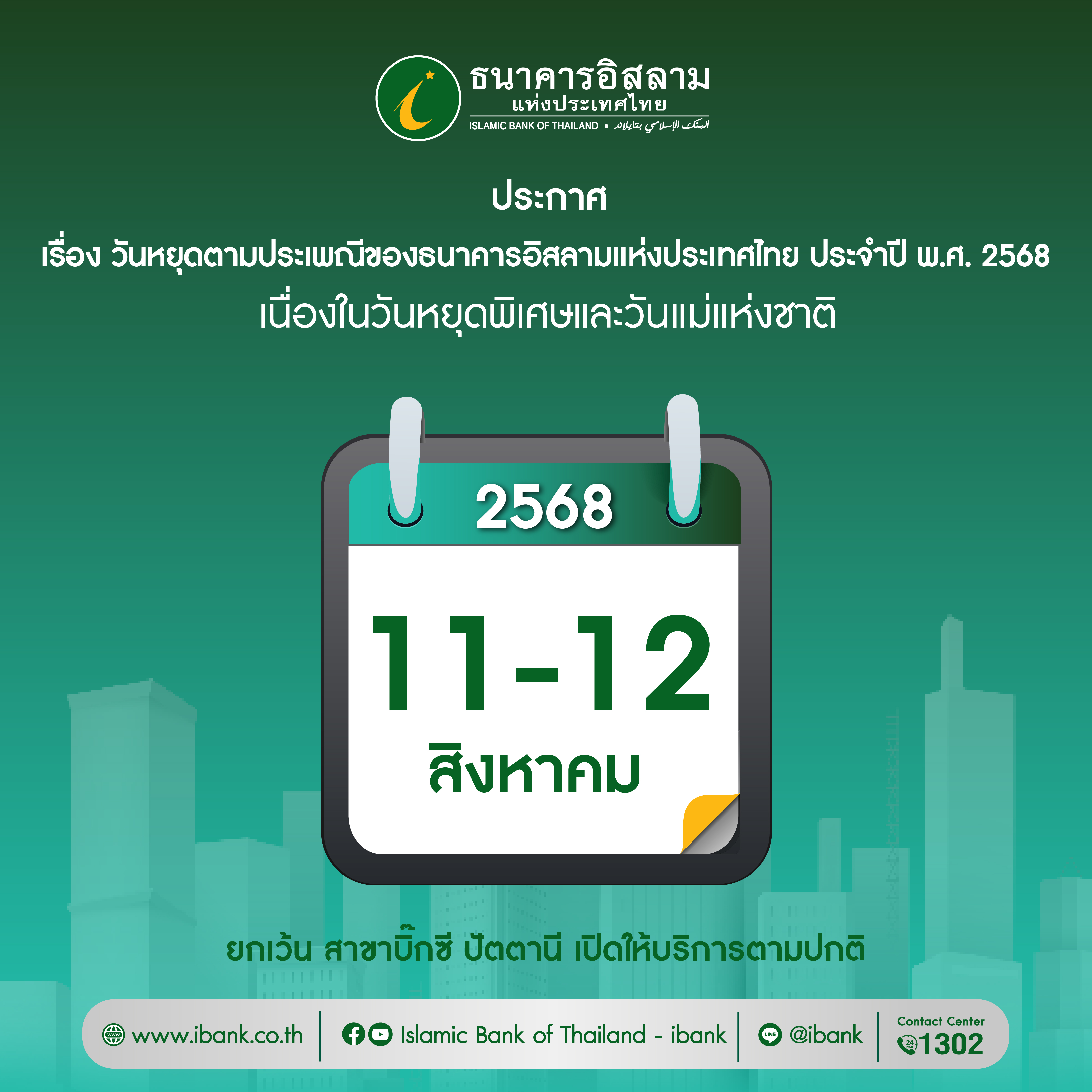 - ประกาศวันหยุดตามประเพณีของธนาคารอิสลามแห่งประเทศไทย ประจำปี พ.ศ. 2568 เนื่องในโอกาสวันหยุดพิเศษและวันแม่แห่งชาติ