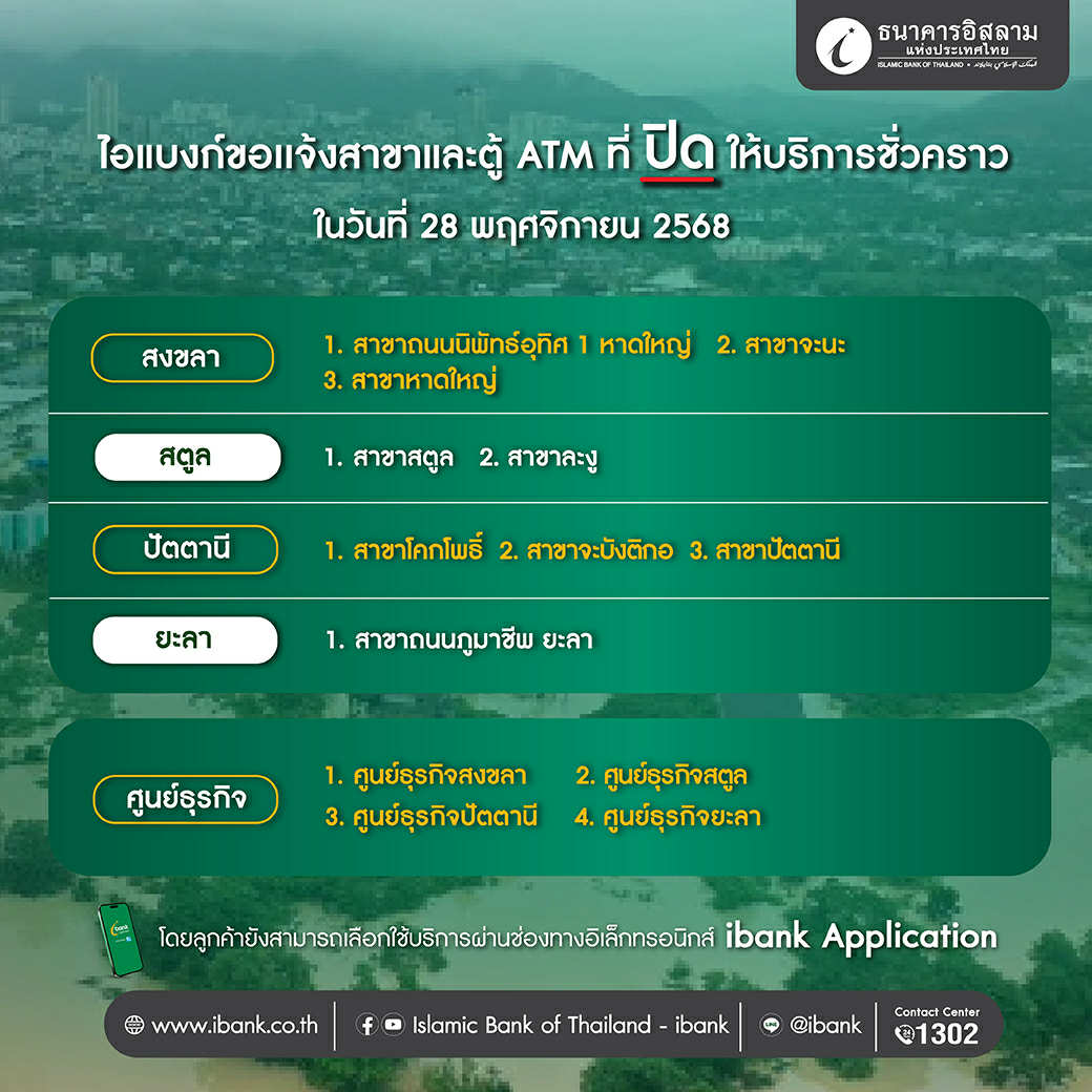 - ธนาคารอิสลามแห่งประเทศไทย (ไอแบงก์) ขอแจ้งสาขาและตู้ ATM ที่ “ปิด” ให้บริการชั่วคราว ในวันที่ 28 พฤศจิกายน 2568