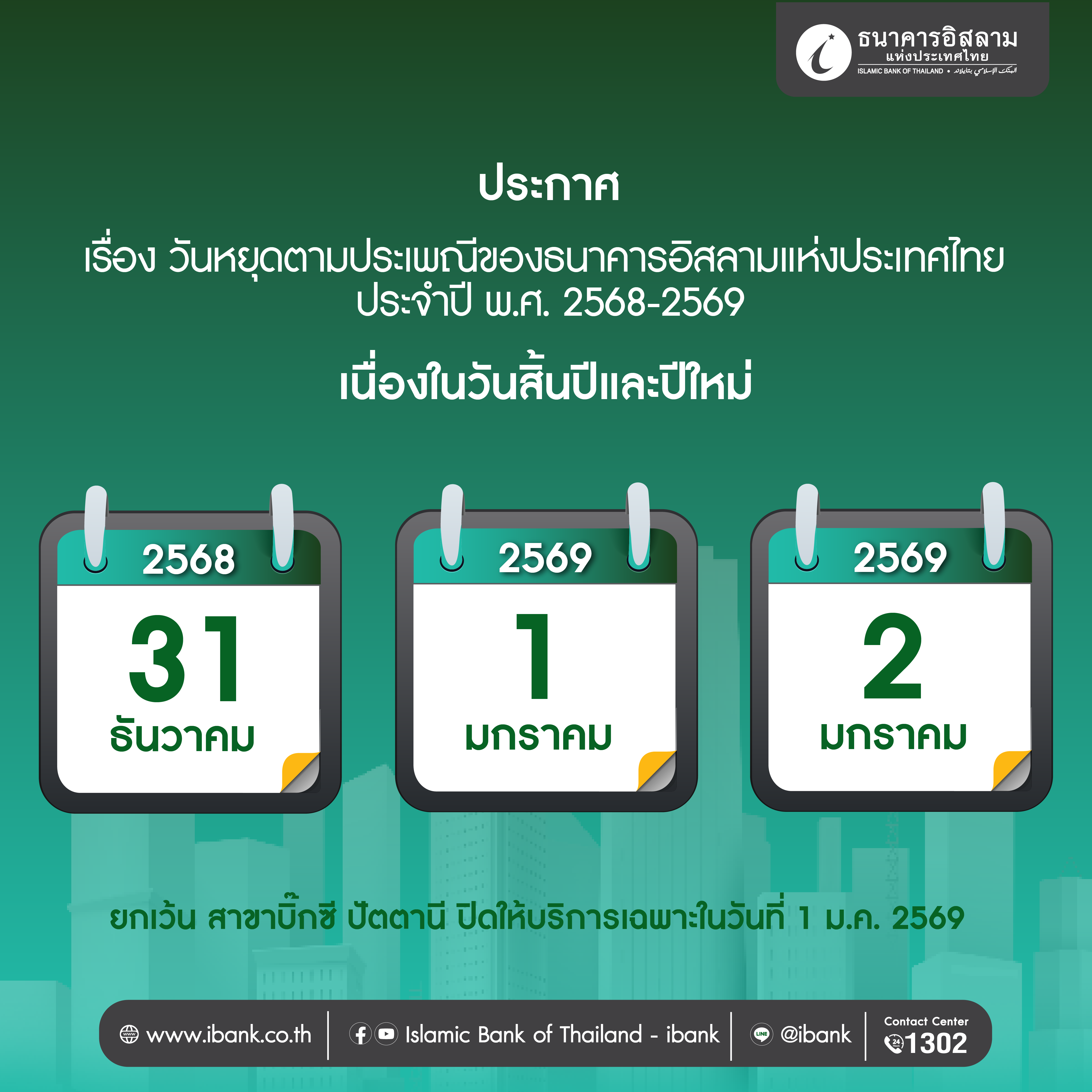 - ประกาศวันหยุดตามประเพณีของธนาคารอิสลามแห่งประเทศไทย ประจำปี พ.ศ. 2568-2569 เนื่องในวันสิ้นปีและปีใหม่
