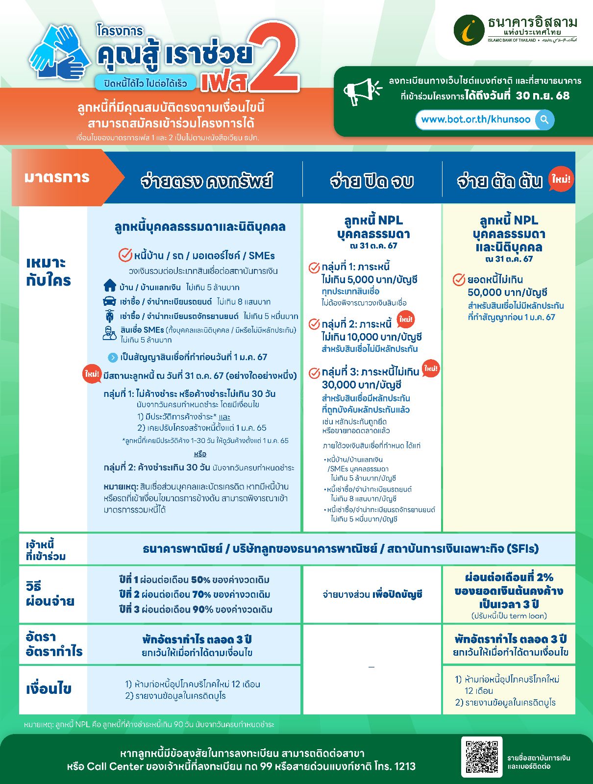 โครงการ “คุณสู้ เราช่วย” โดยการช่วยเหลือจะครอบคลุมลูกหนี้ของธนาคารพาณิชย์ สถาบันการเงินเฉพาะกิจ และผู้ประกอบธุรกิจ Non-Bank ที่เป็นบริษัทในกลุ่มธุรกิจทางการเงินของธนาคารพาณิชย์ ทั้งนี้ พบว่าลูกหนี้ยังคงให้ความสนใจเข้าร่วมโครงการอย่างต่อเนื่อง จึงได้มีการขยายระเวลาลงทะเบียนเข้าร่วมโครงการฯ จนถึงวันที่ 30 กันยายน 2568 (ระยะที่ 2)