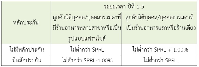 • กรณีเป็นร้านอาหารแรกหรือร้านเดียว วงเงินสินเชื่อไม่เกินร้อยละ 70 ของเงินลงทุนรวม