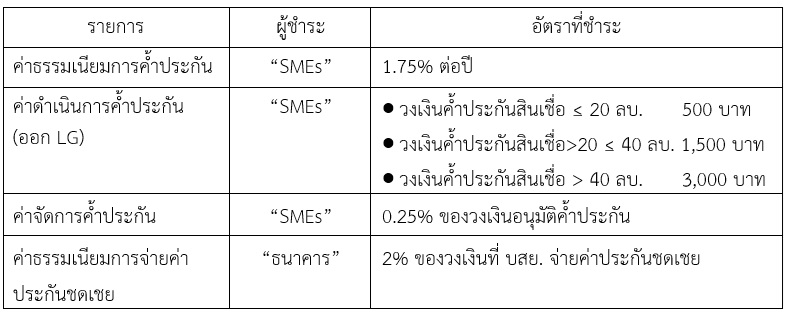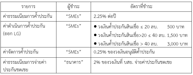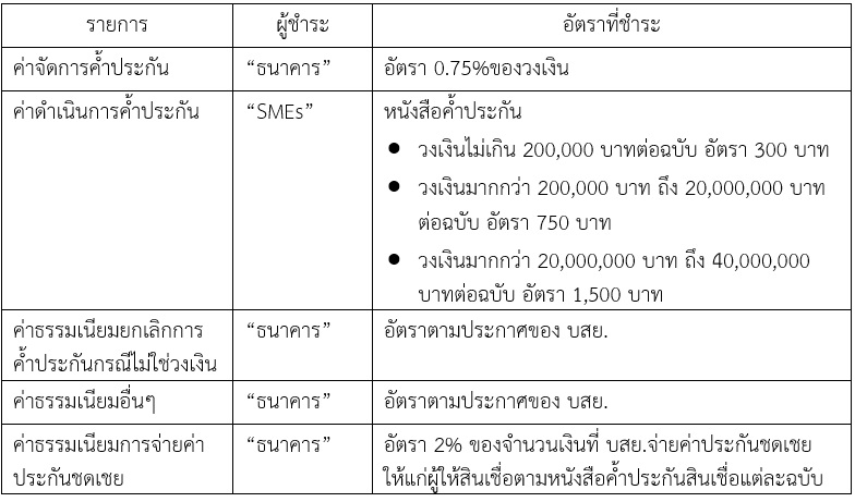 • ค่าธรรมเนียมการค้ำประกัน และค่าธรรมเนียมอื่นๆ ที่เกี่ยวข้องกับการค้ำประกันให้เป็นไปตามหลักเกณฑ์ของ บสย. โครงการค้ำประกันสินเชื่อ บสย.ยั่งยืน (Portfolio Guarantee Scheme ระยะที่ 11)