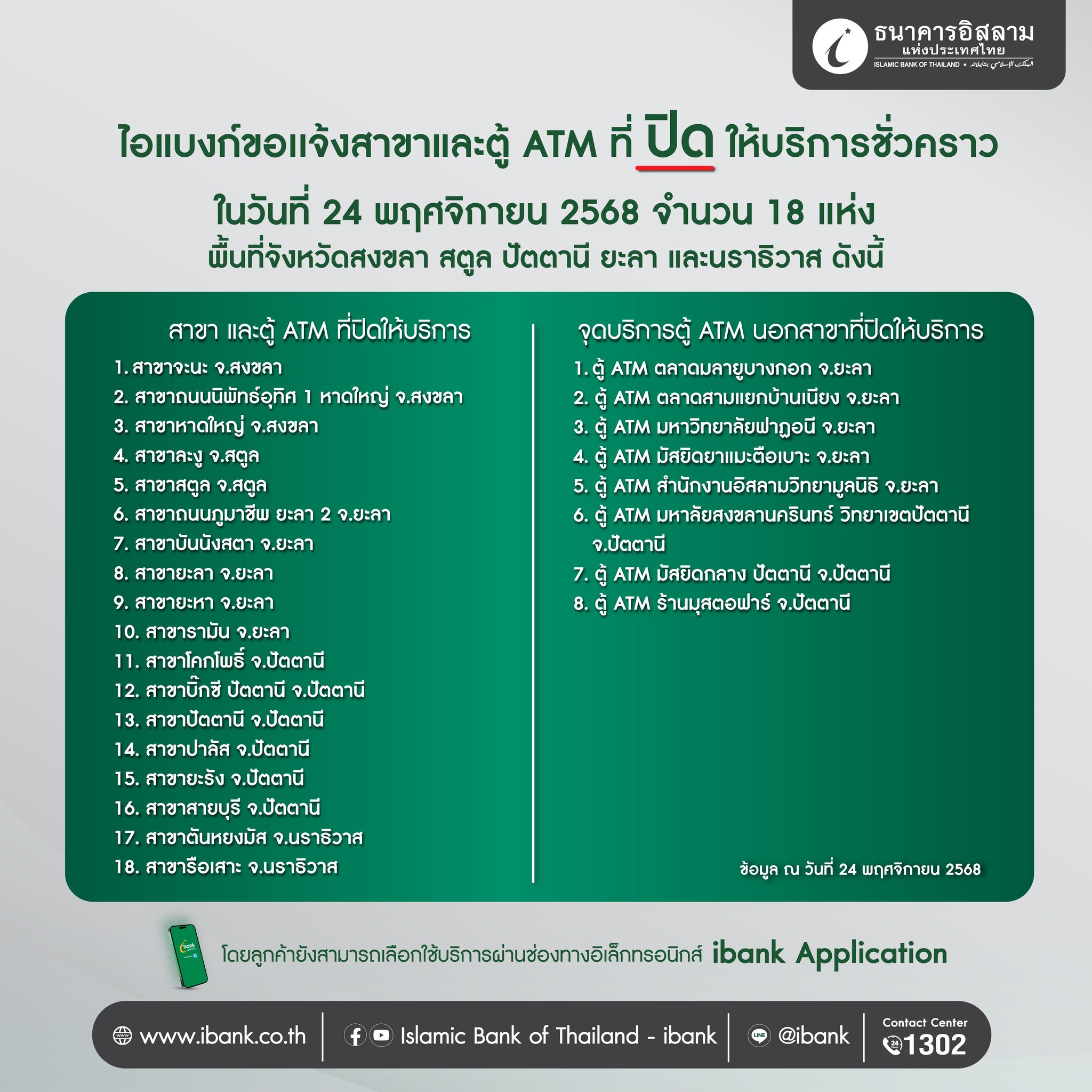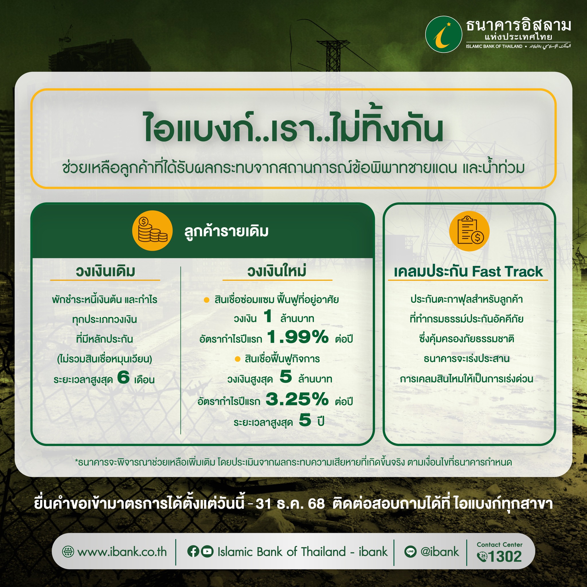 ธนาคารอิสลามแห่งประเทศไทย (ไอแบงก์) ส่งความห่วงใยถึงลูกค้าที่ได้รับผลกระทบจากสถานการณ์ข้อพิพาทชายแดนที่เกิดขึ้นบริเวณชายแดนไทย-กัมพูชา และลูกค้าที่ได้รับความเดือดร้อนจากน้ำท่วมภาคเหนือ ด้วยมาตรการให้ความช่วยเหลือทางการเงิน เพื่อบรรเทาความเดือดร้อนที่เกิดขึ้น ซึ่งส่งกระทบต่อการดำเนินชีวิตและการประกอบอาชีพ ภายใต้โครงการ ไอแบงก์…เรา…ไม่ทิ้งกัน เพื่อให้ความช่วยเหลือแก่ลูกค้าเดิมของธนาคาร ซึ่งมีรายละเอียดดังนี้