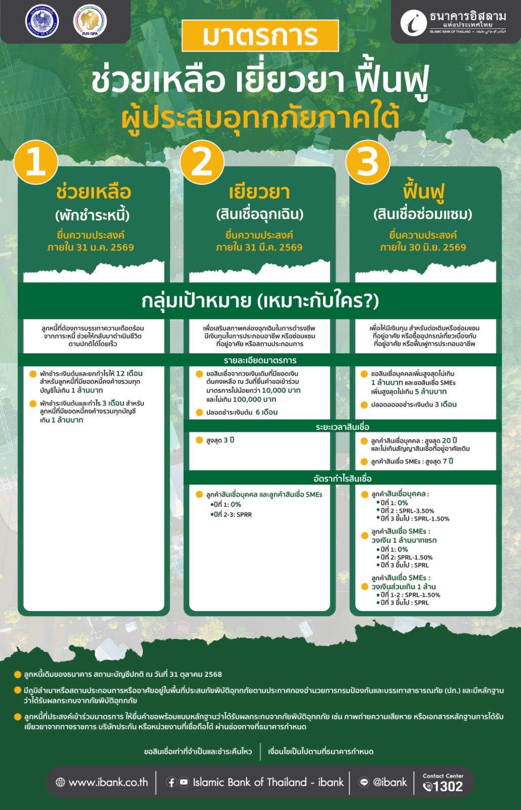 วัตถุประสงค์ : เพื่อลดภาระหนี้ให้แก่ลูกหนี้ของธนาคารที่ได้รับผลกระทบจากภัยพิบัติอุทกภัย และเพื่อบรรเทาความเดือดร้อนให้แก่ลูกหนี้ ให้ลูกหนี้สามารถกลับมาดำเนินชีวิตได้ตามปกติโดยเร็ว