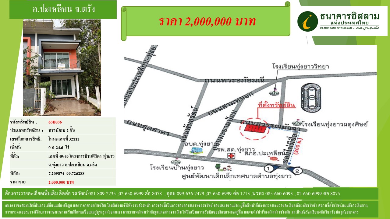 รหัส : 63B036 - ทาวน์โฮม 2 ชั้น เลขที่ 49/49 โครงการบ้านศิริดา ต.ทุ่งยาว อ.ปะเหลียน จ.ตรัง