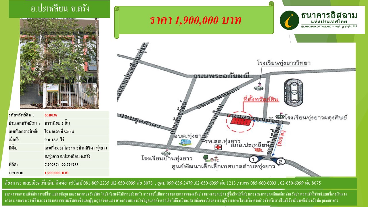 รหัส : 63B038 - ทาวน์โฮม 2 ชั้น เลขที่ 49/52 โครงการบ้านศิริดา อ.ทุ่งยาว อ.ปะเหลียน จ.ตรัง