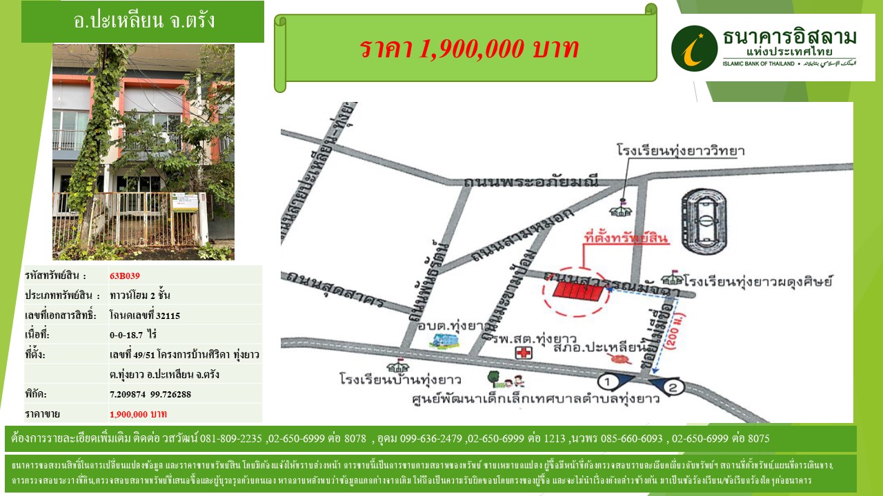 รหัส : 63B039 - ทาวน์โฮม 2 ชั้น เลขที่ 49/51 โครงการบ้านศิริดา ต.ทุ่งยาว อ.ปะเหลียน จ.ตรัง